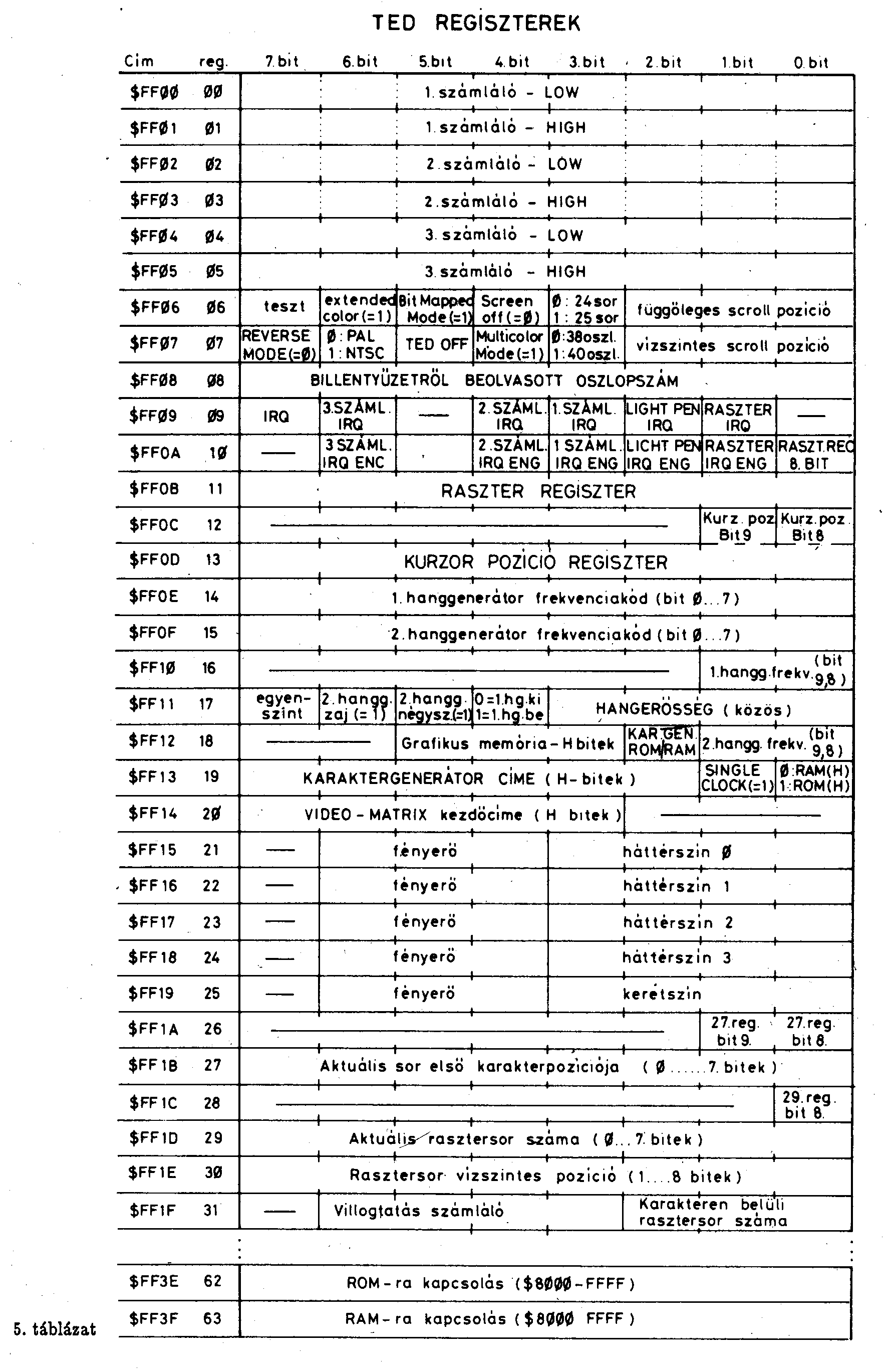 A TED regisztermezőjének első címe $FFOO(65280), ezen a címen találhat6 a O. regiszter, a többi sorban követi. A TED funkci6ir61, és ehhez kapcsolód6an a gép adott programozási lehetőségeiről a megfelelő regiszter leírásánál sz6lunk. Bemutatjuk a regiszterek összefoglal6 táblázatát, amely elősegíti azok munkáját, akik már kellően belejöttek a TED programozásába, és át tudják látni azt a sok szolgáltatást, amelyet ez az intelligens chip nyújtani tud a programoz6nak.